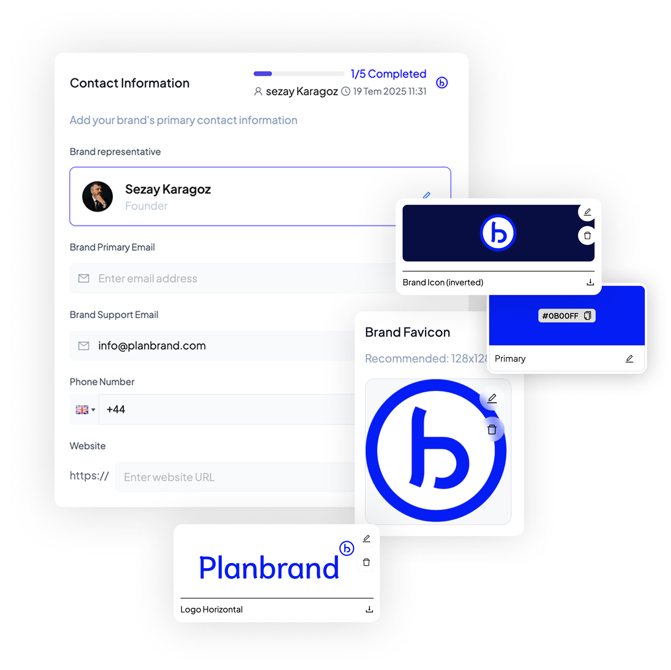 This is where you define your brand’s core contact and presence details. Everything you add here is reused across Planbrand — in emails, pages, forms, and journeys — so your brand always appears consistent and professional.