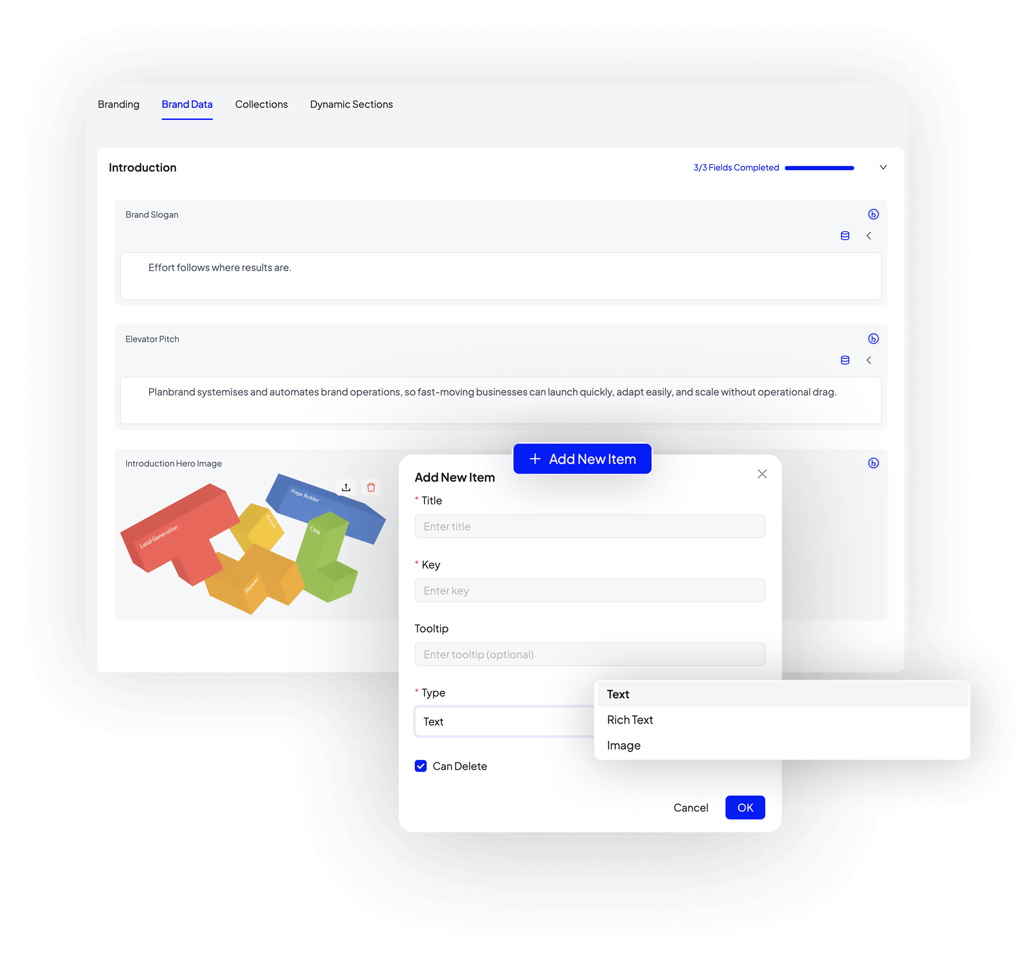 This is where you add the building blocks of your brand — images, text, or other assets — and give each one a clear key. These assets aren’t just stored here; they’re designed to be reused across your whole brand.