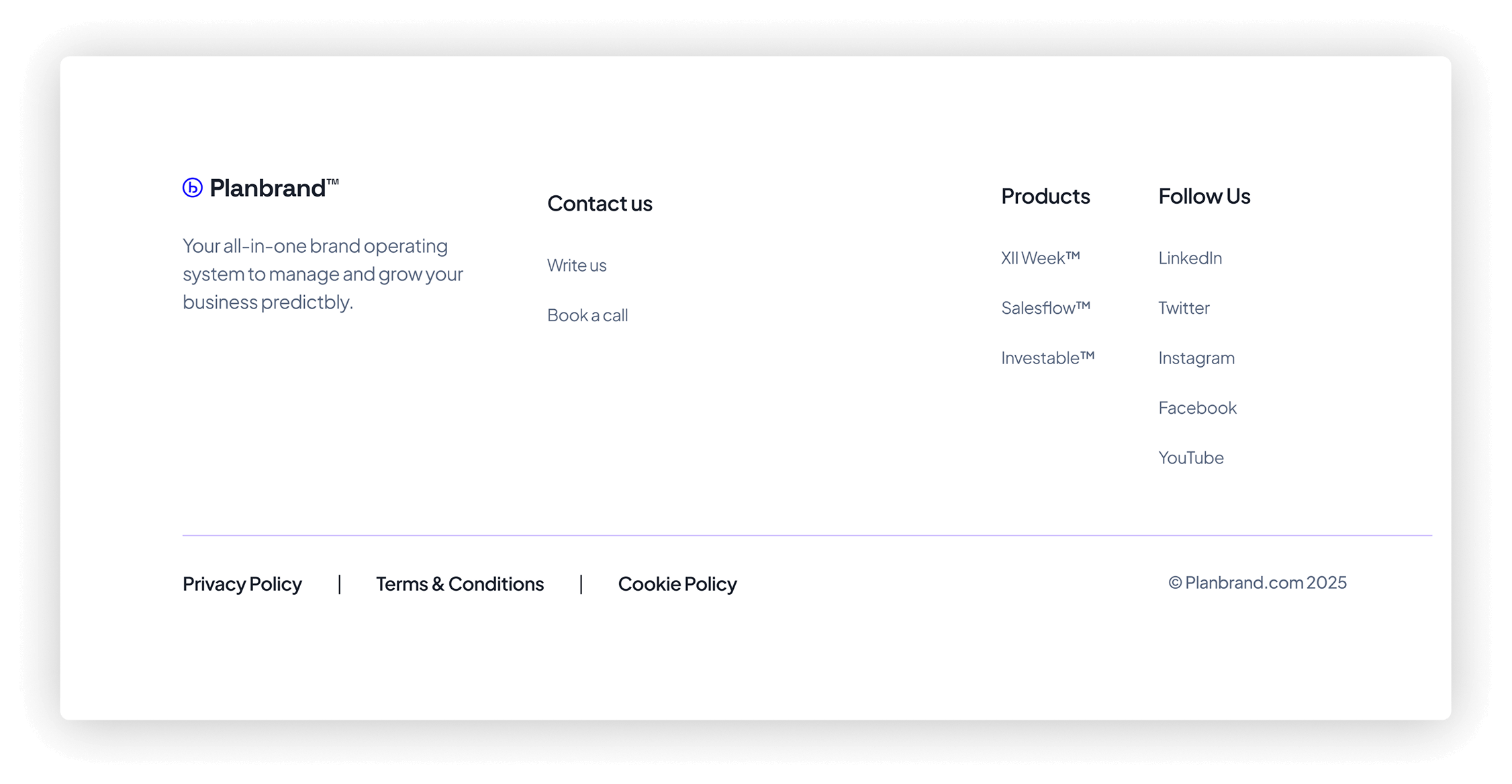In Planbrand, sections like footers, navigation bars, and shared blocks are not copied and pasted. They are connected. When you update them once at the core level, every page using that section updates automatically — across all pages, products, and brands.