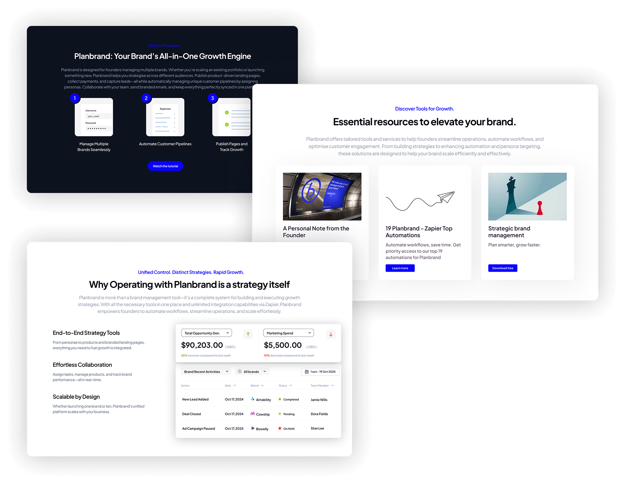 Planbrand’s Page Builder lets anyone create landing pages, product pages, proposals, FAQs, forms, galleries, and more — without breaking structure or losing control. Every section is modular, reusable, and connected to your real brand, product, and customer data.